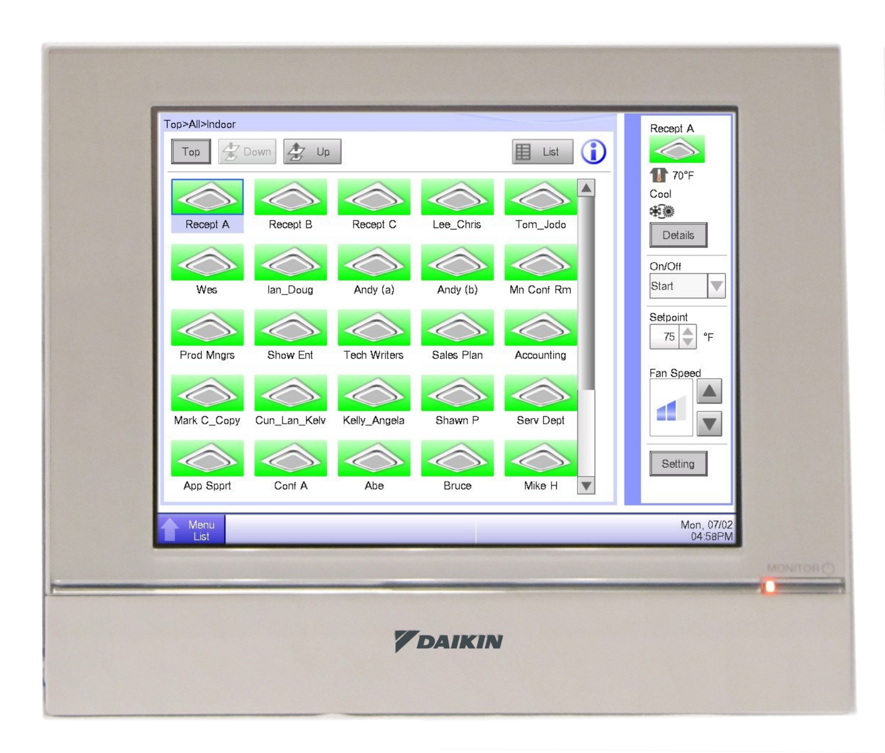 The intelligent Touch Manager (iTM) is an advanced multi-zone controller that controls and monitors the Daikin VRV system. The iTM can also provide a cost-effective mini Building Management System (BMS) solution to integrate and control third party devices through option a software and hardware. If a BMS exists, the iTM can be used as a BACnet gateway interface for BMS integration with the iTM BACnet Server Gateway option.
